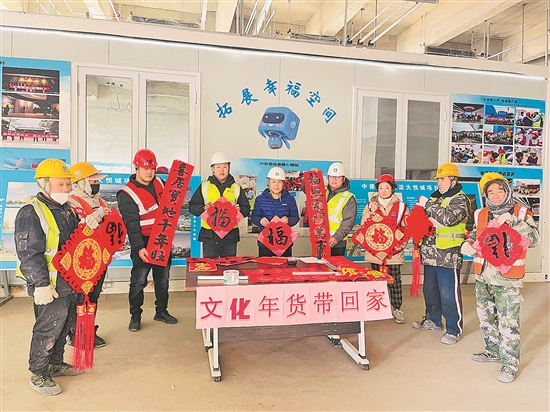 1月26日,中建七局北京市海淀區大悅城項目迎來送“冬日溫暖”和“文化年貨”活動,項目邀請北京市書法協會會員現場揮毫潑墨,公司工會給工友們送上手套、面包、牛奶等物資,以及春聯和“?!弊帧D為活動現場。本報記者 賴志凱 攝