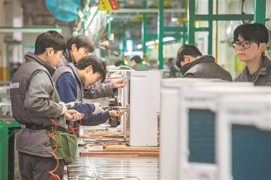 1月30日,位于浙江省湖州市長興經濟技術開發區的海信(浙江)空調有限公司外機車間內,來自長興職教中心的學生正在裝配除濕機。