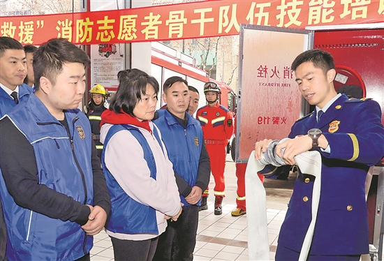 當日,長寧區消防救援支隊組織轄區內由企業消防主管、居委會工作人員和社區居民組成的消防志愿者骨干隊伍,開展消防技能培訓活動,強化消防志愿者隊伍火災防控能力。新華社記者 方喆 攝