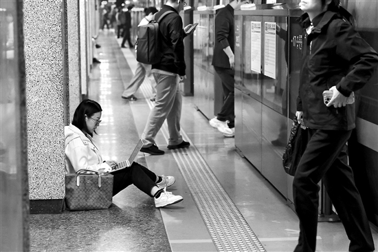 北京地鐵一號(hào)線復(fù)興門(mén)站,一名女士在站臺(tái)上用筆記本電腦編輯文檔。本報(bào)記者 吳凡 攝