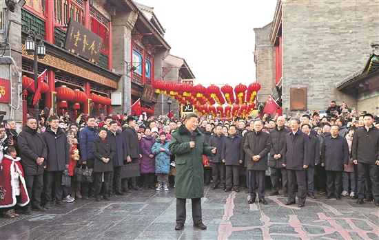 當天下午,習近平來到天津古文化街。街道古色古香,習近平沿街步行,先后走進桂發祥十八街麻花、果仁張、泥人張、楊柳青年畫等特色店鋪,了解產品種類、銷售和傳統文化傳承發展等情況,同店鋪業主、員工和現場群眾互動交流。他說,各級黨委和政府要加強節日期間民生商品的產銷保供,確保數量充足、品類豐富、質量可靠,讓廣大群眾放心消費、快樂過年。習近平指出,中國式現代化離不開優秀傳統文化的繼承和弘揚,天津是一座很有特色和韻味的城市,要保護和利用好歷史文化街區,使其在現代化大都市建設中綻放異彩。