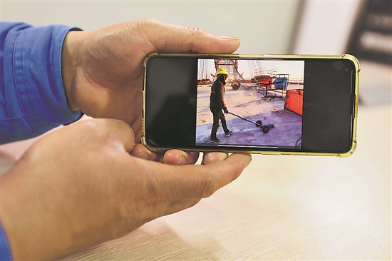 1月31日,全國五一勞動獎章獲得者、A4標架子隊隊長蔣華在介紹他剛發明改造的清膠小工具。