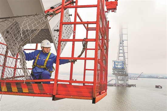 江面之上,連日的陰雨天氣讓人們的體感溫度比地面還要低五六攝氏度。伴隨著陰沉的天氣,350米高的主塔有100多米掩蓋在霧氣里。寒風呼嘯,工人只能裹著厚實的冬裝在橋面上作業,行動也變得比往常遲緩。而過幾天這里還將迎來新一輪降溫天氣。