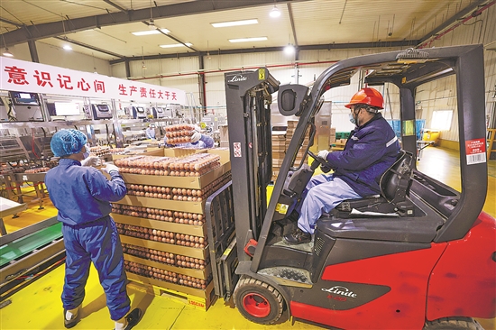2月5日,在慈溪正大蛋業有限公司的車間內,工人把當天產的新鮮雞蛋分類裝箱,準備運往外地商超市場。