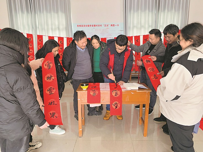圖為謝建林為村民寫(xiě)春聯(lián),共迎春節(jié)。黃昌榮 攝