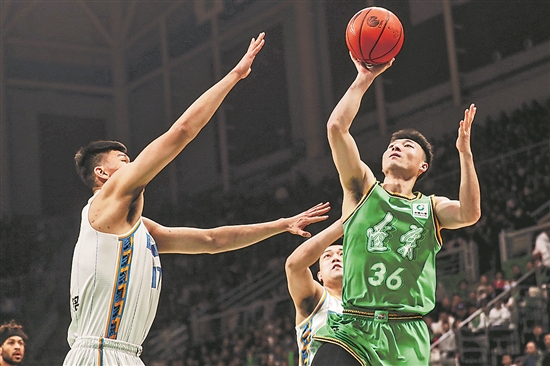 2月5日,在2023-2024賽季中國男子籃球職業聯賽(CBA)常規賽第39輪比賽中,遼寧本鋼隊主場113比85戰勝北京北汽隊。圖為遼寧本鋼隊球員鄢手騏(右)在比賽中投籃。
