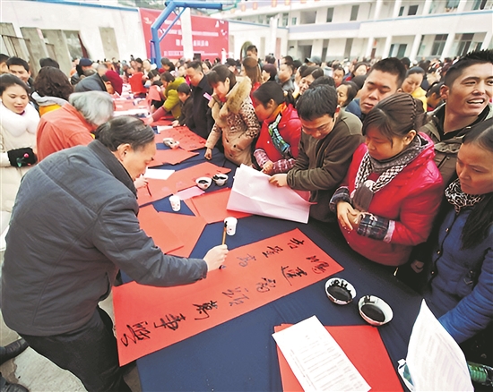 2015年春節前夕,一批特殊的溫暖小分隊帶著筆墨紙硯出發了。他們當中有中國書法家協會的主席、副主席,有廣大職工群眾耳熟能詳的著名書法家。他們走進火車站候車大廳,擺上桌案、鋪開宣紙,黑色的筆墨在火紅的宣紙上游走,氣勢恢宏的“?!弊?、充滿童趣的“福”字應運而生。