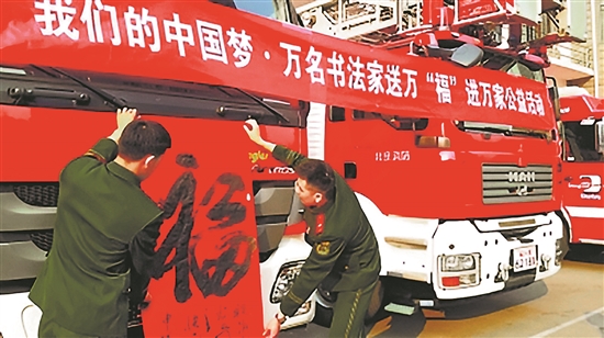 2015年春節前夕,中國書法家協會組織在京的主席團成員及部分理事,到北京市朝陽區公安消防奧林匹克公園中隊慰問。張海、陳洪武、蘇士澍等近20位書法家為戰斗在一線的消防員們現場書寫“福”字和春聯。