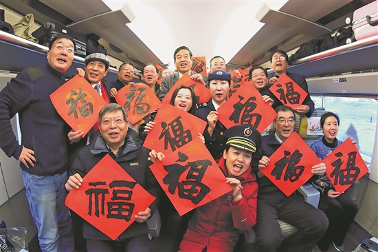 2019年1月19日,書法家一行乘坐列車迎春送“福”。