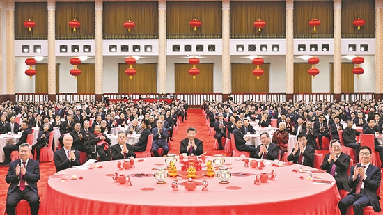 人民大會堂宴會廳燈光璀璨、喜氣洋洋,各界人士齊聚一堂、共迎新春,現場洋溢著歡樂祥和的節日氣氛。