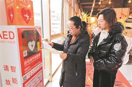 近日,建德市衛健局工作人員(左)在商場內查看AED設備維護記錄。