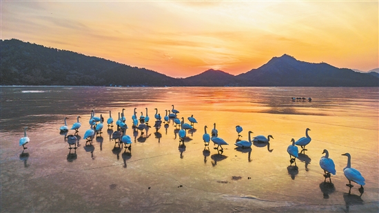 近日,西伯利亞遠途而來的白天鵝棲息在北京懷柔水庫,夕陽下形成一道美麗的風景線。孫永東 攝/視覺中國