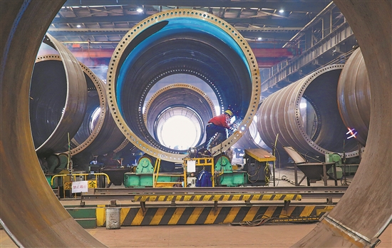 2月18日,江蘇連云港經濟技術開發(fā)區(qū)一家風電設備公司車間內,工人在生產風電塔架。