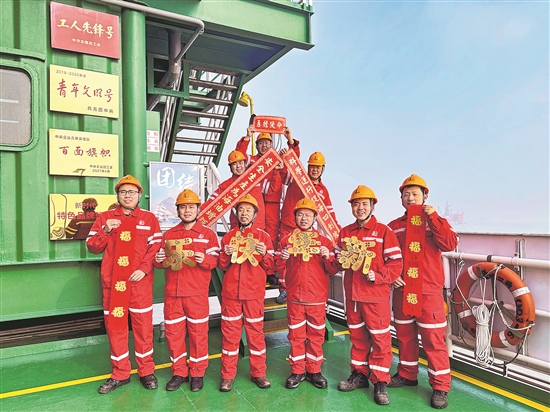 春節期間,中國石化勝利油田埕島中心三號平臺的班組職工堅守生產一線,全力保障節日期間海上油氣生產安全平穩運行。圖為除夕,埕島中心三號平臺的職工給大家拜年。 張燦 攝