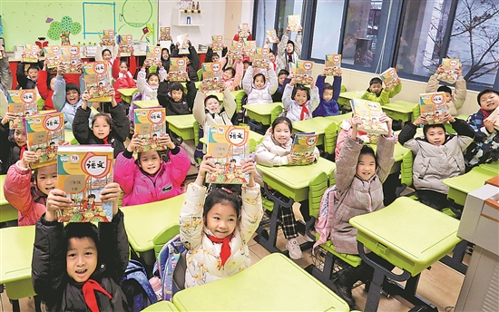 2月20日,在江蘇省蘇州市金閶實驗小學校,小學生展示領到的新學期課本。