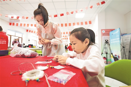 2月19日,內蒙古自治區呼倫貝爾市東山街道遠山社區黨群服務中心,社區兒童在老師的指導下制作“非遺”太陽花。本報記者 蔚可任 攝