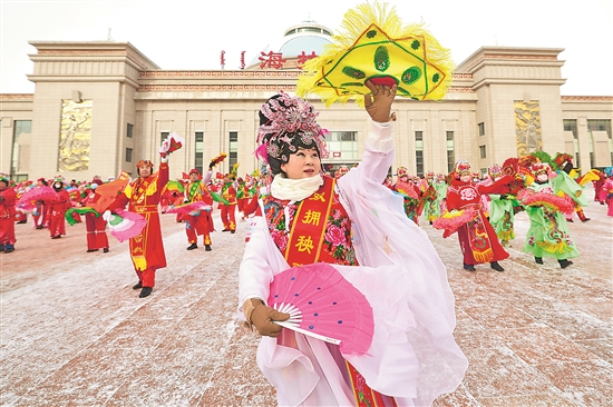 2月19日,呼倫貝爾市海拉爾區老年人體育協會舉辦的2024年全民健身大拜年秧歌聯動活動在海拉爾站前拉開帷幕。本報記者 蔚可任 攝