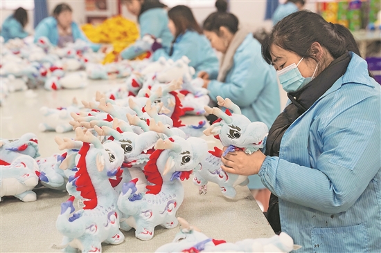2月20日,安康某動漫文化產業(yè)公司的工人在生產車間內加工龍年生肖主題的毛絨玩具。