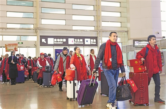 2月22日,在成都東站,外出務工人員排隊進入候車室準備乘坐D1805次列車前往廣州。
