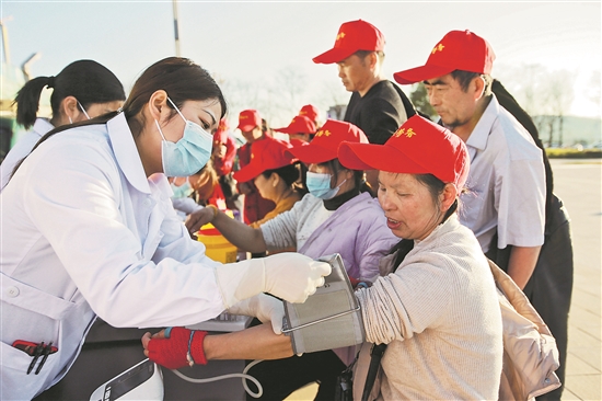 近日,云南曲靖北站站前廣場,醫護人員為外出務工人員測量血壓和提供健康咨詢。當日,曲靖市組織春節后農村勞動力轉移就業集中歡送儀式,為千余名農民工提供專列“點對點”輸出服務。近年來,當地采取“點對點”“一站式”全程保障服務措施,讓務工人員實現“出家門、上車門、進廠門”無縫銜接,確保外出務工人員安全、有序返崗。楊俊鵬 攝/視覺中國