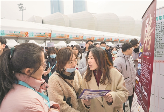 2月25日,參加“起跑春天”2024杭州人才交流大會的求職者在一家企業展位前咨詢招聘信息。