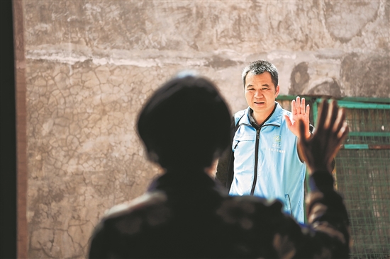 近日,在廣西興業縣山心鎮公和村,鐘偉平(右)出診結束后與村民揮手道別。