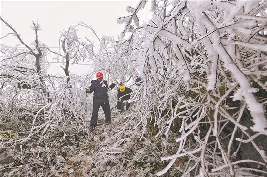 連日來,受冷空氣影響,廣西桂北高寒山區(qū)出現(xiàn)低溫雨雪冰凍天氣,導(dǎo)致電力線路覆冰,當?shù)貑拥蜏赜暄┍鶅鰹?zāi)害Ⅲ級應(yīng)急響應(yīng)。新華社記者 黃孝邦 攝