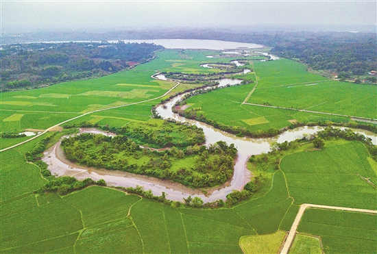 圖為2月26日在海口市瓊山區(qū)拍攝的三十六曲溪及周邊的早稻田(無人機(jī)照片)。