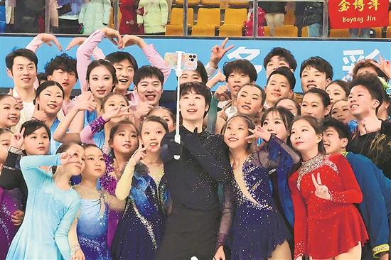 2月27日,“十四冬”花樣滑冰表演滑在內(nèi)蒙古呼倫貝爾市內(nèi)蒙古冰上運動訓(xùn)練中心舉行。圖為表演滑結(jié)束后,運動員們在賽場合影。本報記者 蔚可任 攝