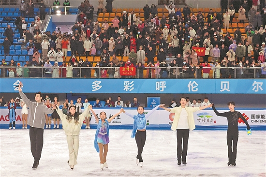 2月27日,“十四冬”花樣滑冰表演滑在內(nèi)蒙古呼倫貝爾市內(nèi)蒙古冰上運動訓(xùn)練中心舉行。圖為表演滑結(jié)束后,運動員們向觀眾致意。 本報記者 蔚可任 攝