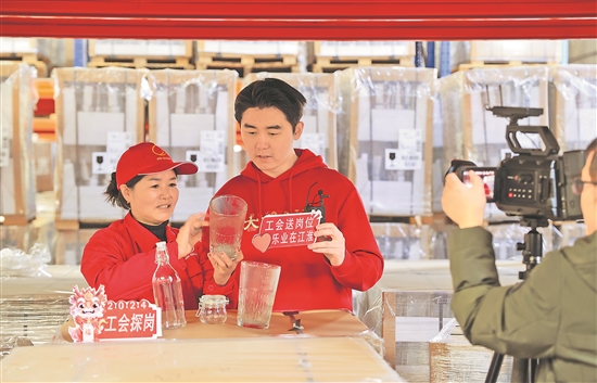 2月28日,安徽省淮北市總工會“入企探崗”直播團隊在用工企業直播企業信息。