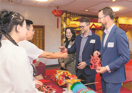 當地時間2月27日,在澳大利亞堪培拉中國駐澳大利亞大使館,來賓欣賞中國剪紙藝術。新華社發(儲晨 攝)