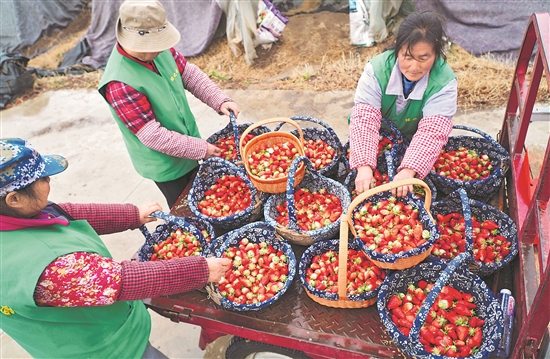 2月29日,在棗莊市薛城區常莊街道吳莊村一處大棚草莓種植園內,員工將剛采摘的草莓裝車。