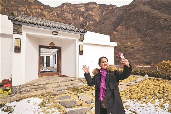 民宿經營者在天津前干澗村的自家民宿前用手機錄制短視頻進行推介。