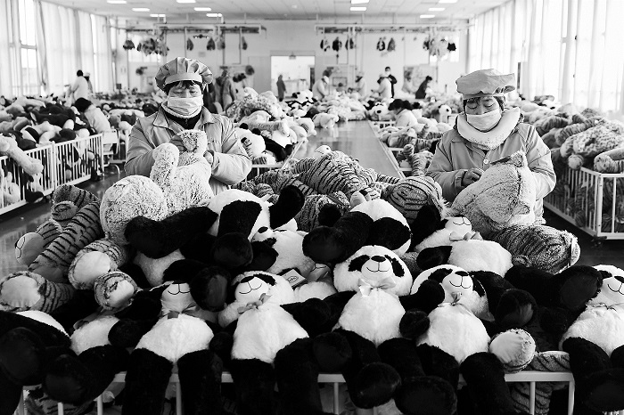 3月2日,江蘇連云港,贛榆區石橋鎮一家玩具出口企業的工人在縫紉毛絨玩具。