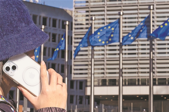 近日,一名女子在比利時布魯塞爾歐盟委員會總部前使用蘋果手機。歐洲聯盟委員會3月4日對美國蘋果公司處罰18.4億歐元,理由是蘋果在流媒體音樂業務中有壟斷行為。歐盟的調查緣于瑞典流媒體音樂服務商聲田公司2019年針對蘋果公司提出的反壟斷投訴。新華社記者 孟鼎博 攝