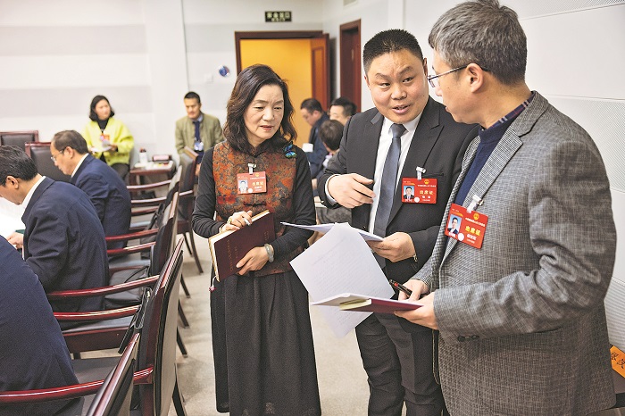 3月7日,在江蘇代表團小組討論會前,江蘇省太倉萬方國際碼頭有限公司營運操作部門機班副大班長褚鋒代表(右二)邀請蘇繡藝術家姚建萍代表(右三)、中國科學院院士崔鐵軍代表(右一)給自己的發言稿提建議。