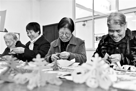 3月2日,在濱州市博興縣博華老年公寓文體活動室,老人們在剪紙。為讓農村老人老有所養、老有善養,山東省濱州市博興縣呂藝鎮積極整合資源,通過政企合作,由當地龍頭企業投資建設集養老、醫療護理、文化娛樂于一體的民辦非營利性綜合養老機構博華老年公寓。新華社記者 郭緒雷 攝