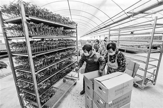 3月6日,在位于浙江嘉興桐鄉(xiāng)市高橋農(nóng)業(yè)科技產(chǎn)業(yè)園的中科康成數(shù)字化育苗車間內(nèi),工人把培育好的種苗裝箱。目前,該育苗基地年產(chǎn)2億株蔬菜、瓜果種苗,主要供應(yīng)長三角地區(qū)消費(fèi)市場(chǎng)。