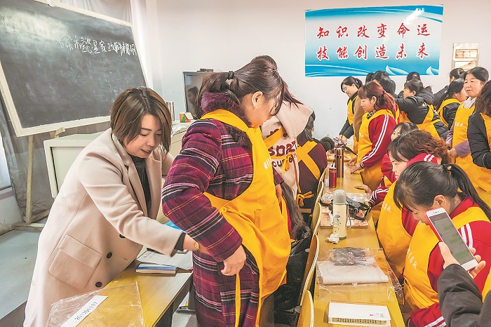 山西呂梁,馬金蓮代表(左一)在自己創辦的家政公司培訓班上,幫護工學員系圍裙。
