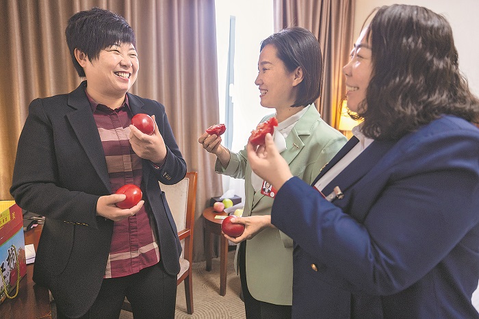 3月7日,在山西代表團駐地,馬金蓮代表(左一)邀請同組的代表品嘗村里種植的西紅柿。