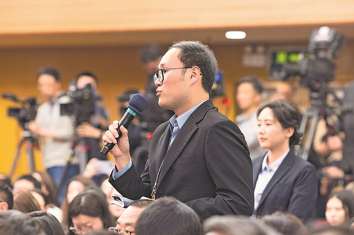 圖為本報記者李潤釗在十四屆全國人大二次會議民生主題記者會上提問。本報記者 王偉偉 攝