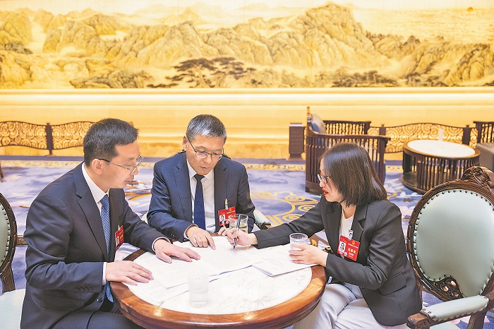 3月9日,在湖南代表團駐地,常德煙草機械有限責任公司高級技師符國強代表、中車株洲所董事長李東林代表、株洲天橋起重機股份有限公司新品事業部部長田際群代表(從左至右)就傳統制造業企業如何推動以舊換新展開了討論。