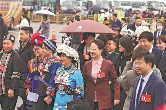 3月5日,十四屆全國人大二次會議在京開幕,代表們攜手入場。