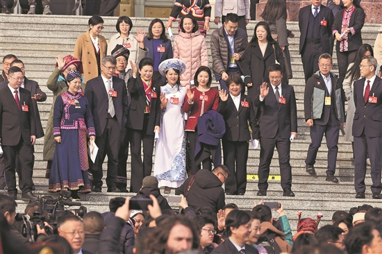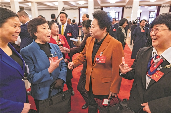 3月8日,參加全國兩會的女代表互致節日祝福。當陜西代表團馬紅麗代表(右一)問山西代表團郭鳳蓮代表(左二)的年齡時,郭鳳蓮代表伸出手指表示自己近80歲了。