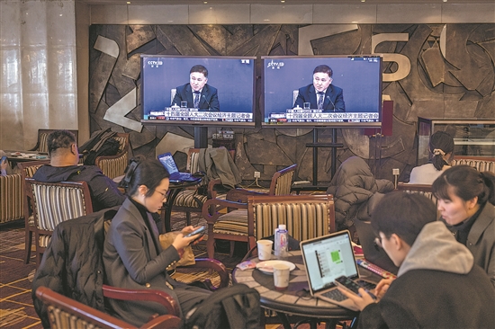 3月6日,十四屆全國人大二次會議舉行經濟主題記者會。圖為全國兩會新聞中心休息區。