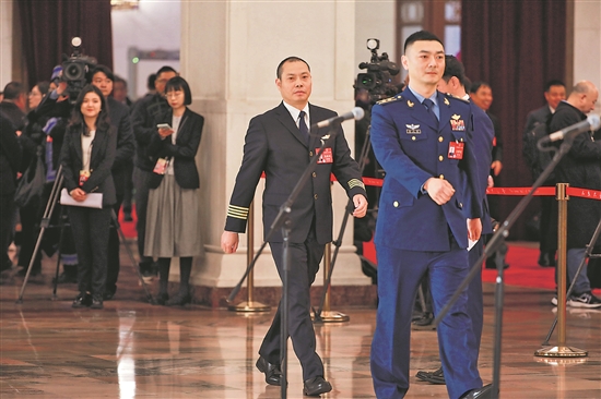 3月5日,殲-20飛行員高中強代表(右一)與“英雄機長”劉傳建代表“同框”走上首場“代表通道”。