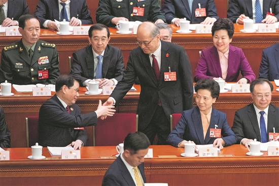 3月8日上午,北京人民大會堂,最高人民法院院長張軍向大會作完最高人民法院工作報告后,最高人民檢察院檢察長應勇(前排左一)與他握手致意。