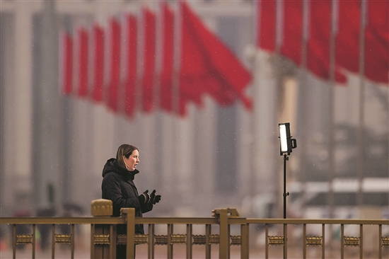 3月5日,十四屆全國人大二次會議在京開幕。開幕會開始前,一名外媒記者在天安門廣場做出鏡報道。