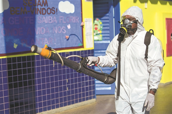 當(dāng)?shù)貢r(shí)間3月9日,在巴西首都巴西利亞一所學(xué)校內(nèi),公共衛(wèi)生人員噴灑滅蚊劑。目前,巴西首都聯(lián)邦區(qū)以及里約熱內(nèi)盧州、阿克雷州等6個(gè)州已因登革熱暴發(fā)宣布進(jìn)入公共衛(wèi)生緊急狀態(tài)。巴西衛(wèi)生部3月8日更新的數(shù)據(jù)顯示,今年以來(lái),巴西已記錄1342086例登革熱病例(含疑似病例),其中363例確診病例死亡。新華社發(fā)(盧西奧·塔沃拉 攝)